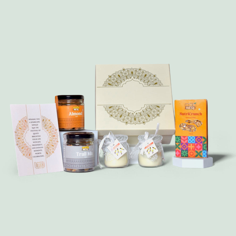 Celebrate Diwali with the Healthynutsy Festive Crunch Box – a healthy and delicious gift featuring almonds, trail mix, peanut chikki, scented candles, and a festive greeting card in premium packaging. Perfect for corporate & personal gifting.