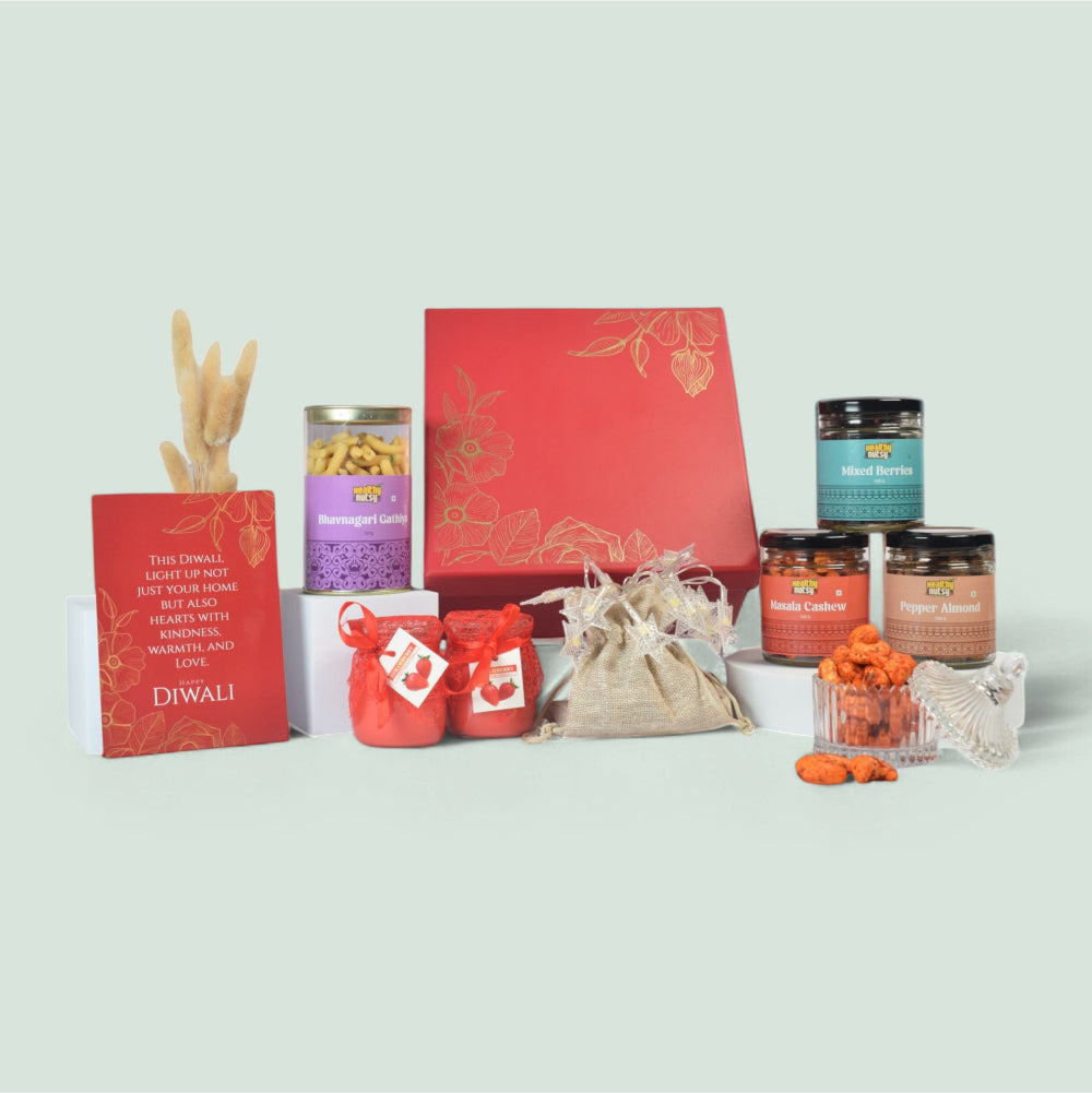 Gift joy this Diwali with the Healthynutsy Festive Delight Hamper, featuring Bhavnagari gathiya, masala cashew, pepper almond, mixed berries, fairy lights, scented candles, and a festive greeting card in premium packing.